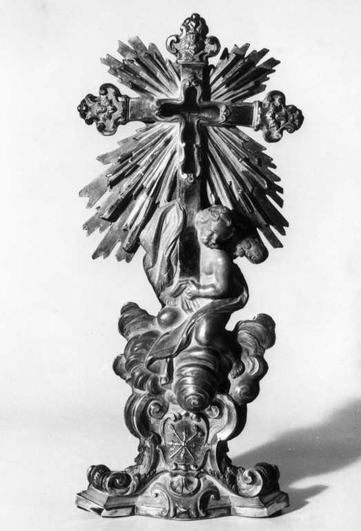base mistilinea con due volute, al centro delle quali è uno scudo con simboli della passione (lancia, spugna). Fusto figurato, con angelo tra nubi, che sostiene, con le mani velate da un panno, una croce raggiata con terminazioni mistilinee. Al centro della croce, teca cruciforme