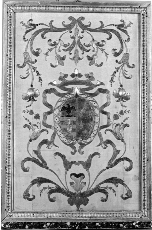 Pannello ricamato con volute foglicee in oro, recante al centro stemma coronato