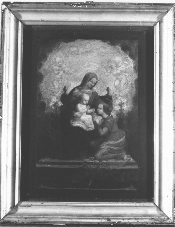 La scena si svolge secondo la consueta iconografia. Sullo sfondo una gloria di cherubini contorna il trono della Madonna, ai cui lati sono due vasi di fiori. Gli strumenti del martirio sono in primo piano. Le tinte calde e soffuse si articolano sulla gamma dei rossi, dei bruni e dei dorati