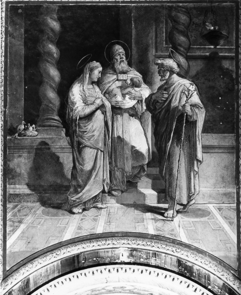Personaggi: Maria; Giuseppe; Gesù Bambino; Simeone. Attributi: (Giuseppe) verga fiorita. Abbigliamento. Interno. Animali: colombe. Oggetti: lampada; cesto