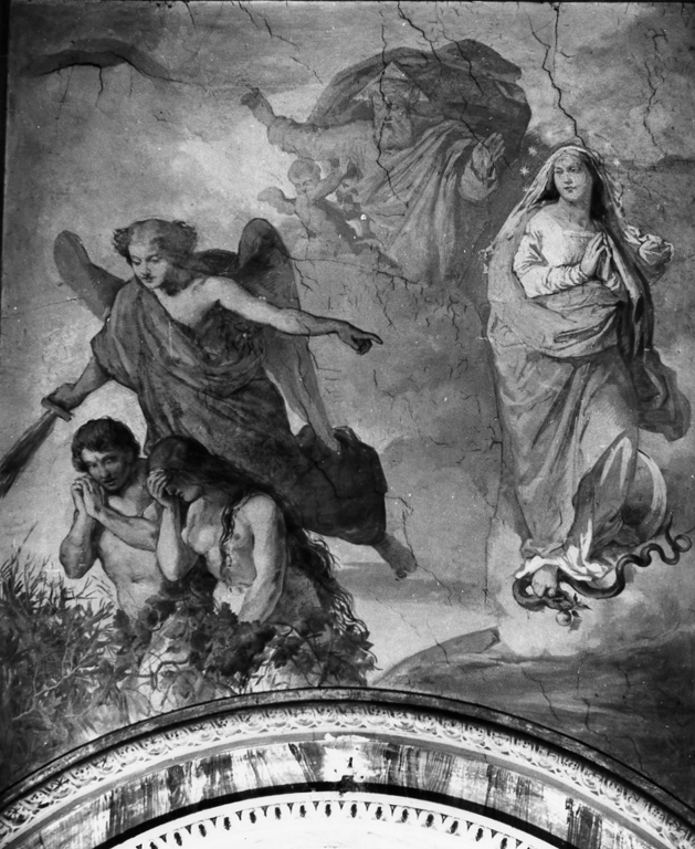 Personaggi: Adamo; Eva; Dio Padre; Madonna; Arcangelo Michele. Attributi: (Arcangelo) spada. Attributi: (Madonna) serpente. Figure: angelo. Fenomeni metereologici: nuvole. Piante: cespuglio
