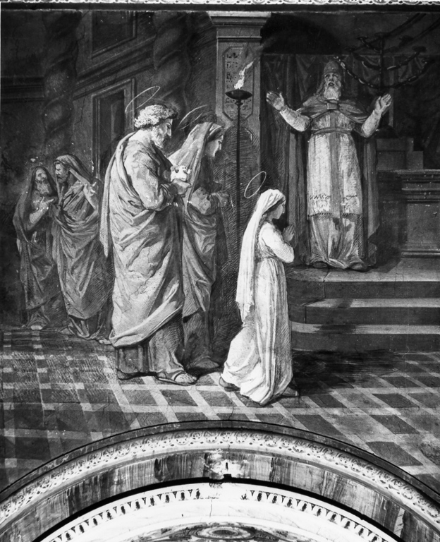 Personaggi: Sant'Anna; Gioacchino; Maria; Zaccaria. Figure maschili: sacerdoti. Interno. Oggetti: altare; candelabro; lampada. Architetture