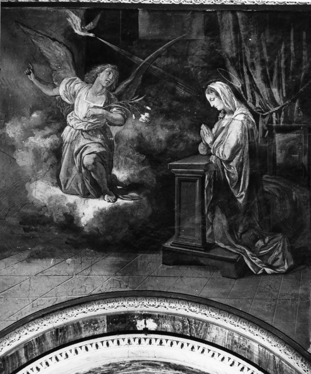 Personaggi: Madonna; Arcangelo Gabriele. Attributi: (Gabriele) giglio. Abbigliamento. Simboli: colomba dello Spirito Santo. Interno. Oggetti: inginocchiatoio; cortina