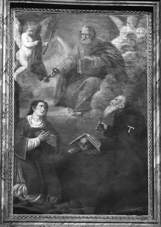 Personaggi: San Pietro; Santo Stefano Protomartire; Sant'Antonio Abate. Figure: angeli. Attributi: (San Pietro) chiavi. Attributi: (Santo Stefano) pietre. Attributi: (Sant'Antonio) campanella; libro; teschio