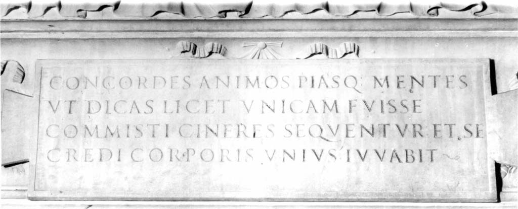 - ISCRIZIONI targa sul sarcofago - CONCORDES ANIMOS PIASQ. MENTES/VT DICAS LICET VNICAM FVISSE/COMMISTI CINERES SEQVENTVR ET SE/ CREDI CORPORIS VNIVS IVVABIT - lettere capitali -