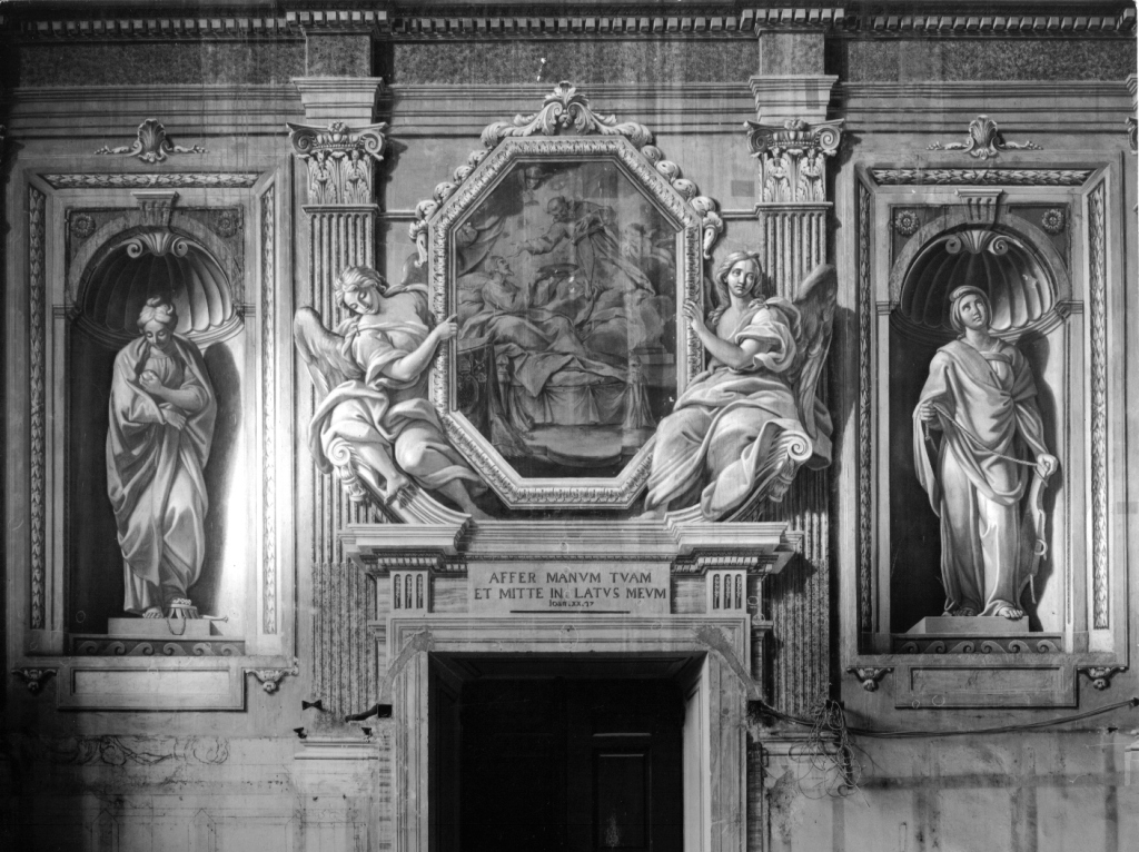 Decorazione pittorica costituita centralmente da cornice ottagonale con raffigurazione sacra e sottostante iscrizione, affiancata da coppia angelica e da paraste con capitelli. Sui lati nicchie con raffigurazioni di sante