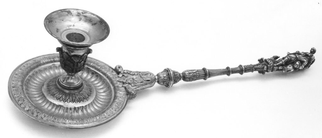 Basso candeliere portatile formato da una base a forma di piattello circolare e una da una lunga impugnatura