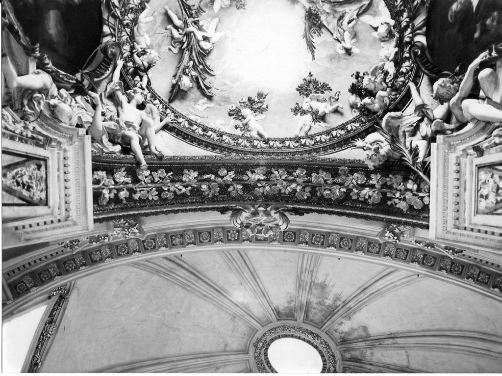 Figure: angeli; cherubini. Attributi: (angelo) vessillo; (cherubini) palme; rose; rami di ulivo