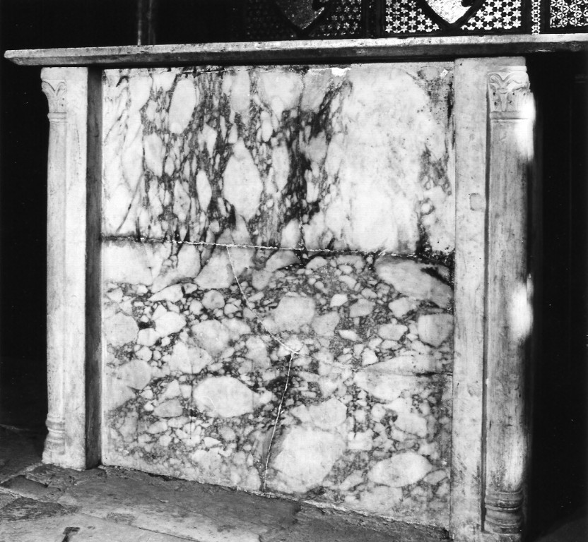 Mensa d'altare rettangolare, con quattro piccoli avancorpi angolari, su cui poggiano colonnine corinzie