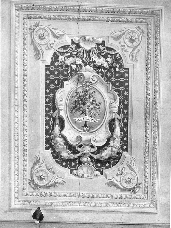 La cornice rettangolare mostra una fascia a foglie stilizzate, una semplice ed una ad ovoli. Agli angoli, quattro fiori in un cerchio presentano ai due lati due foglie di palma incrociate. Una cornice mistilinea interna è decorata alle estremità superiore ed inferiore da due conchiglie. In alto, pendono due ghirlande di rose e di gigli. Il fondo è dipinto con una decorazione a fiori e stelle. Il simbolo mariano è a sua volta all'interno di una cornice a volute contrapposte, dalla quale ricadono in basso due nastri e due festoni di spighe, melograni ed uva. Un platano, con un cartiglio in corrispondenza del tronco, è rappresentato in posizione centrale
