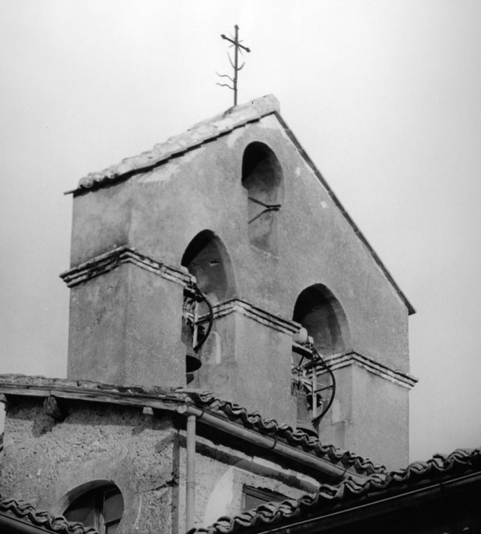 Campanile a vela in muratura intonacata di giallo, con due aperture ogivali per le campane, ed una superiore centinata. Tetto di tegole, con croce in ferro battuto sulla sommità