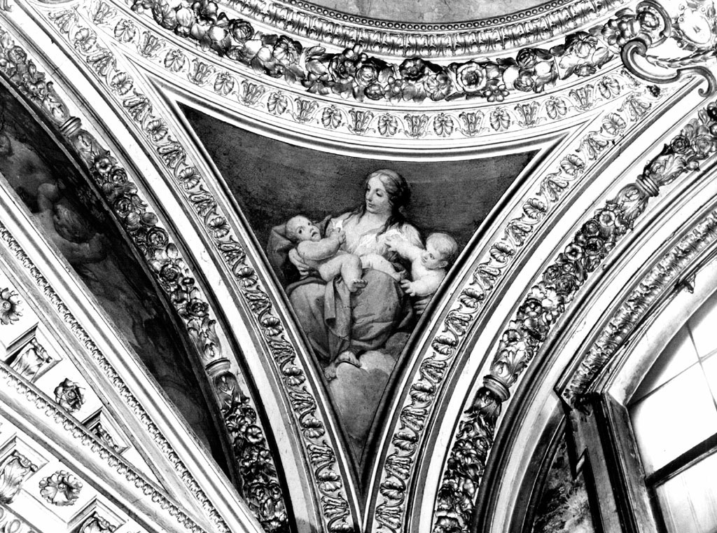la decorazione comprende i pilastri angolari (a ciascun angolo mostrano la sovrapposizione di tre lesene, scanalate e rudentate) con capitello corinzio, sormontati da trabeazione continua con fregio a motivi vegetali, cornici con ovoli e fogliette, rosette e mensole; al di sopra si impostano gli archi con cornici a palmette e fiori; attorno all'ovale della volta e alle lunette, cornici con festoni di fiori, fogliette e ovuli, decorate ai punti di inconto da mascheroni con festoni di boccioli entro cartocci