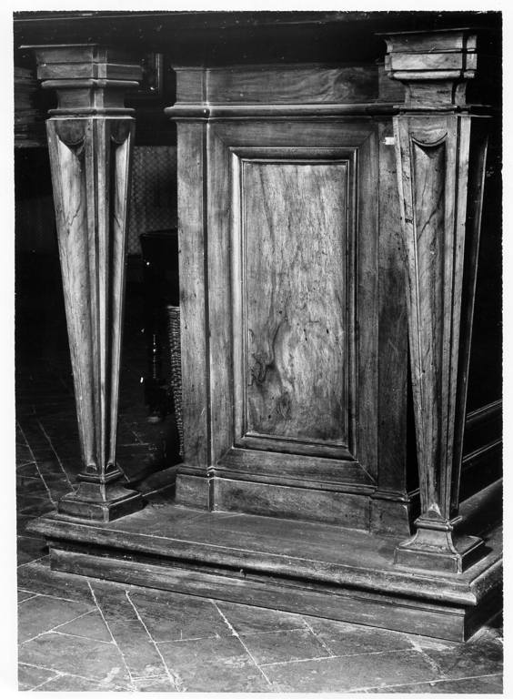 La scansia poggia su una base aggettante; gli sportelli sono scanditi da lesene lineari. Ai lati due basi coniche sorreggono il piano