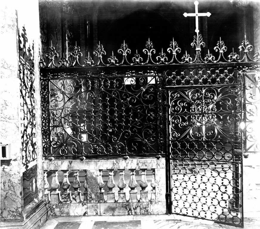 cancello diviso in tre parti da motivi decorativi :i n basso elementi a volute giustapposte; al centro fascia con due file di anelli; in alto quattro gruppi di volute arabescate occupano simmetricamente la specchiatura rettangolare. E' sormontato da una fascia con due file di anelli. Transenne laterali: poggianti in basso su bulbi, chiuse sui lati e in alto da cornice con motivi di gigli entro ovali, compongono con elementi a voluta un campo ovale al centro. Volute a 'S' a formare losanga entro cui sono disposti i cerchi. Chiude in alto trabeazione con motivi a giglio di due misure. Al centro croce apicale