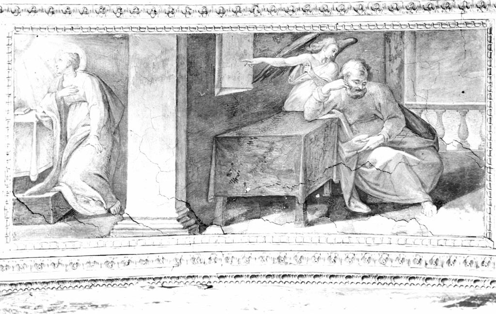 Personaggi: Maria Vergine; san Giuseppe. Figure: angelo. Oggetti: inginocchiatoio; tavoli; libro; balaustrata