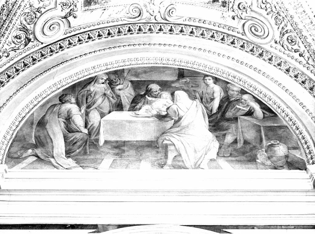 Personaggi: Madonna; Gesù Bambino; san Giuseppe. Figure: sacerdote; figure maschili; figure femminili. Oggetti: tavoli; libro; vasi; vassoi; bastone; coltellino chirurgico