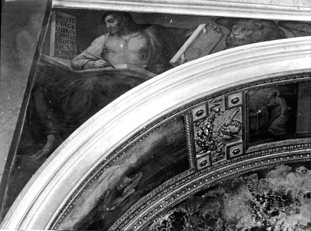 Personaggi: san Marco Evangelista. Attributi: (san Marco Evangelista) leone alato. Oggetti: libro; penna; calamaio; lapide