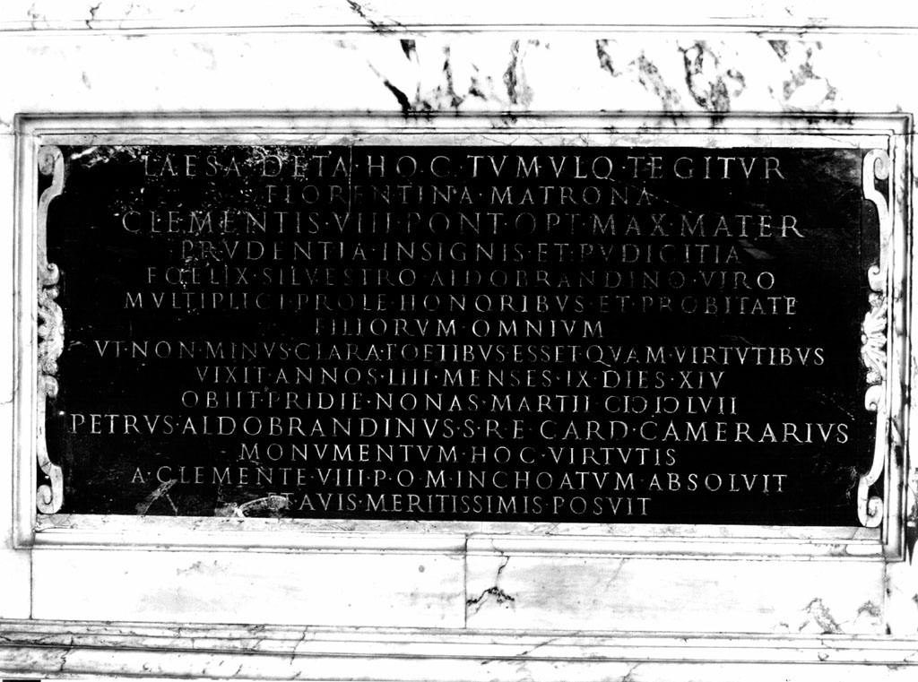 - NOTIZIE STORICO CRITICHE piu' o meno concorde l'attribuzione del progetto e delle sculture agli artisti che vi posero mano. Inizialmente il monumento era previsto per il cardinale Giovanni Aldobrandini, poi il pontefice Clemente VIII ne decise nel 1604 la sostituzione con la statua della madre. E' dispersa la sua statua giacente, eseguita dal Bonvicino. I monumenti dlla cappella furono inaugurati nel 1611