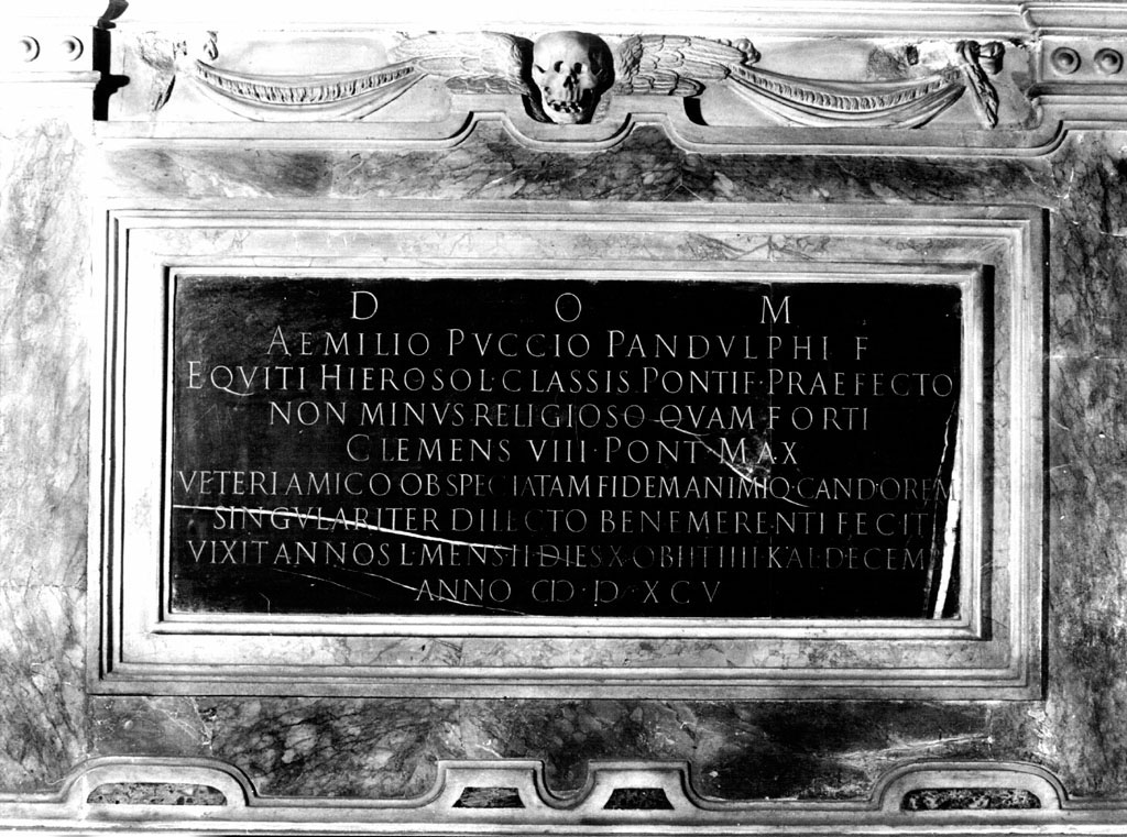 - ISCRIZIONI nella lastra sotto il sarcofago - D.O.M./ AEMILIO PUCCIO PANDVLPHI F./ EQVITI HIEROSOL. CLASSIS PONTIF. PRAEFECTO/ NON MINVS RELIGIOSO QVAM FORTI/ CLEMENS VIII. PONT. MAX/ VETERI AMICO OB SPECTATAM FIDEM ANIMIQ CANDOREM/ SINGVLARITER DILECTO BENEMERENTI FECIT/ VIXIT ANNOS L. MENS. II. DIES X. OBIIT IIII KAL. DECEM./ ANNO MDXCV - lettere capitali - a solchi -
