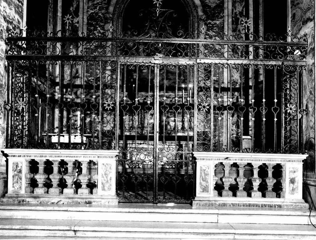 ciascun settore: base modanata, con due pilastri ai lati (a pianta quadrata, con specchiature in marmi diversi sulle facce) ai quali sono addossati i semibalaustri; tra questi, quattro balaustri, sagomati a base quadrata, in diverso colore. In alto, cornice piana modanata