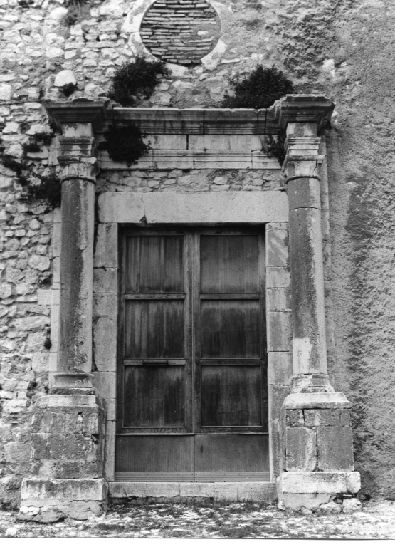 Due colonne lisce su alto basamento con capitello a fogliami sorreggono un'alta trabeazione che, alle sue estremità, aggetta fortemente tanto da fungere anche da pulvino