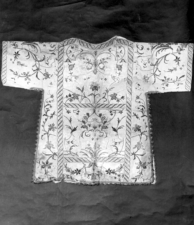 Bordata in basso e lungo i fianchi da passamaneria, ripartita e decorata al bordo delle maniche da galloni decorati da un motivo a fune ritorta; il tessuto è decorato da racemi floreali sparsi
