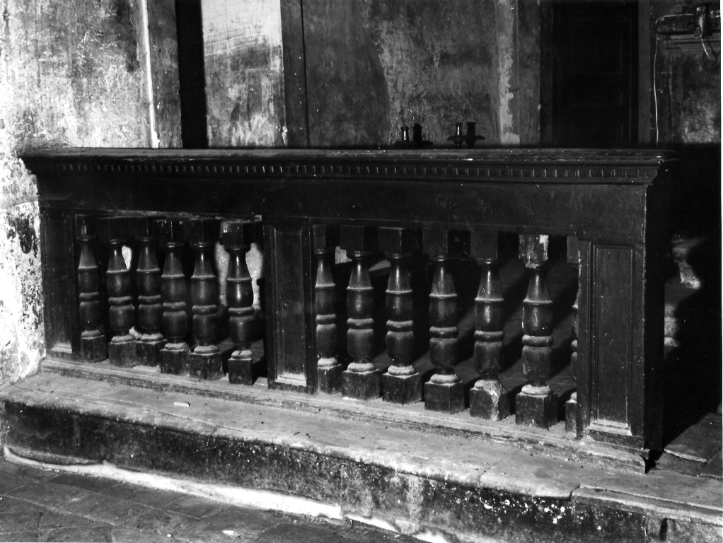 Balaustra con piano d'appoggio leggermente aggettante con cornice dentellata, suddivisa da tre pilastrini con riquadri verticali, i balaustri posti su base a dado sono torniti a rocchetto