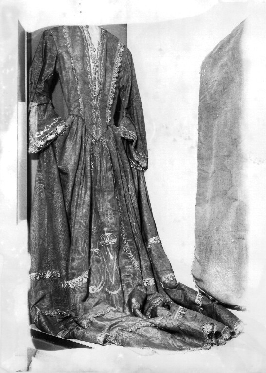 Vestito femminile in seta cangiante guarnito da gallone a ventagli. Sulla gonna è ricamato il monogramma mariano sormontato da corona