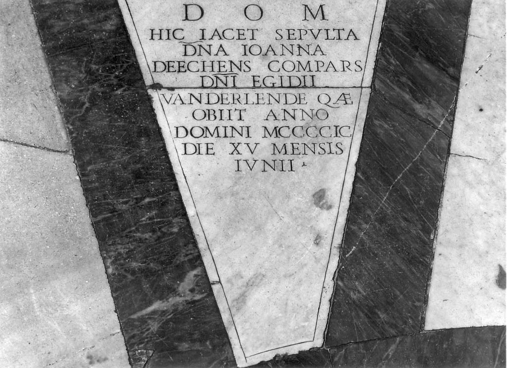 - NOTIZIE STORICO CRITICHE La lastra è settecentesca e risale alla ristrutturazione della chiesa e alla ricostruzione del pavimento, effettuate con il lascito del Van Haringhen tra il 1705 e il 1715. Il personaggio ricordato è Johanna Deechens, moglie di Egidio Vanderlende, morì a Roma il 15 giugno 1499