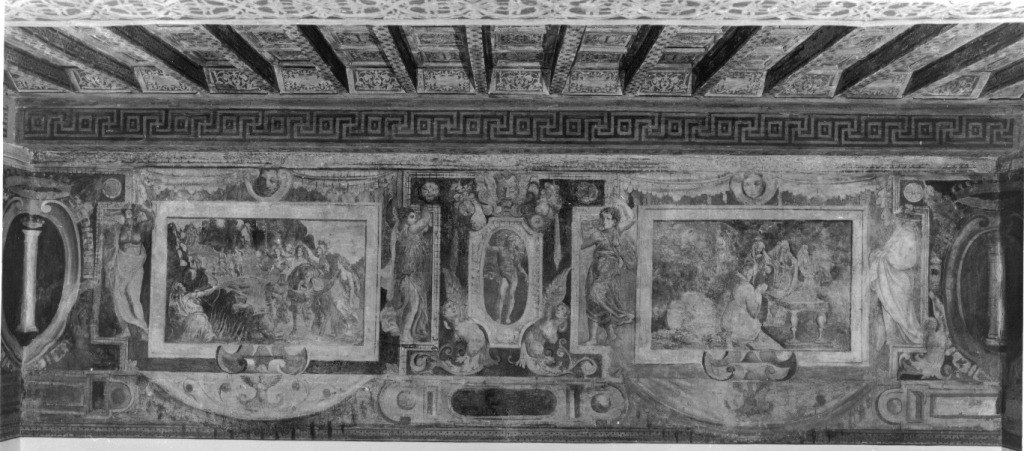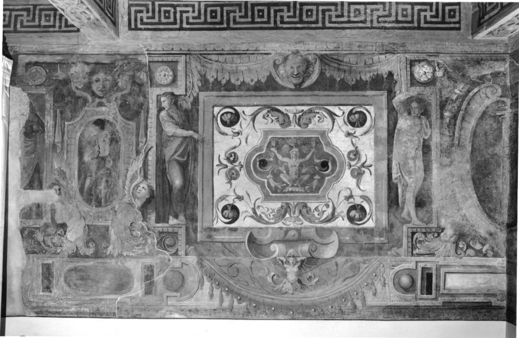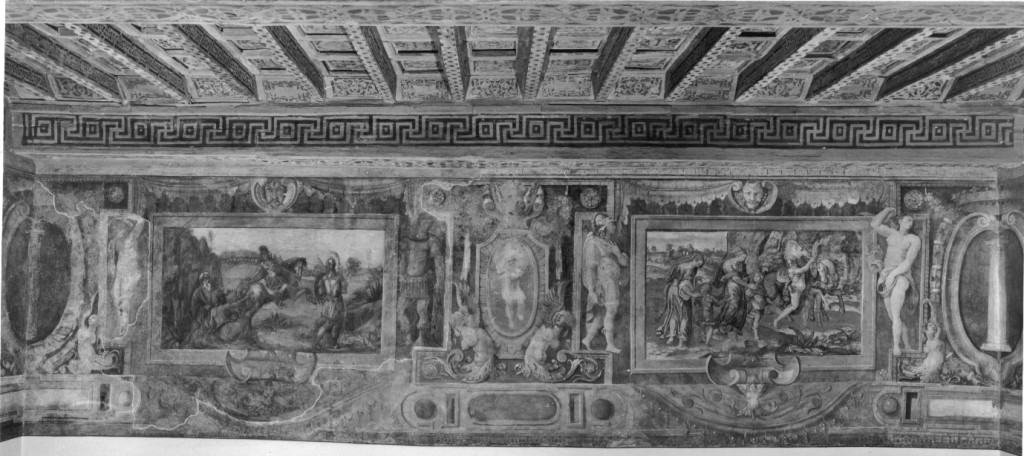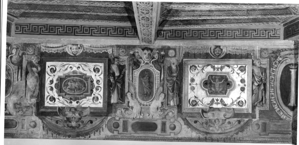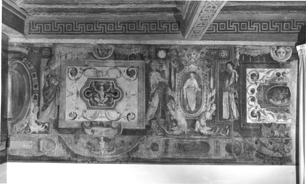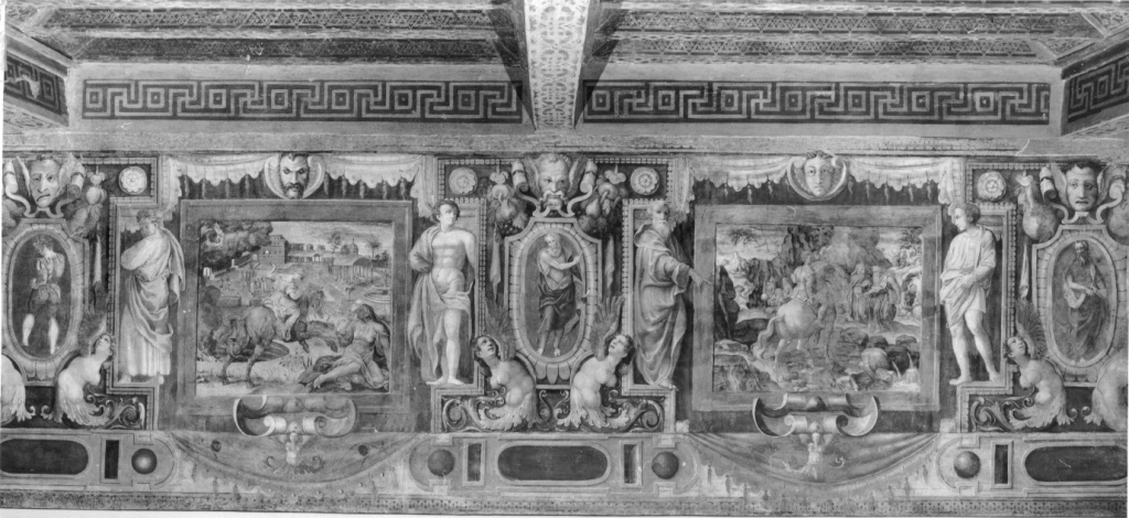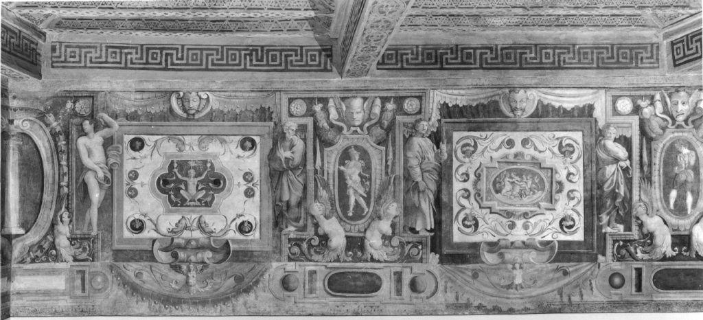 Il fregio scorre in alto, lungo le quattro pareti di un ambiente a pianta rettangolare. E' suddiviso in più riquadri raffiguranti motivi decorativi a grottesche, scene mitologiche, figure intere e scene allegoriche. Negli angoli compaiono degli stemmi e sopra i riquadri delle maschere I lati corti sono caratterizzati da due scene principali, contenute entro cornice dipinta rettangolare e affiancate da figure femminili e maschili drappeggiate; al centro scudo sagomato contenente figura e in basso decorato da figure femminili desinenti in volute fogliacee. Lati lunghi simili nella decorazione generale ai lati corti, ma caratterizzati da due scene principali poste al centro della parete e affiancate su entrambi i lati da coppie di riquadri con grottesche, aventi al centro cartigli decorativi con figura accovacciata e piccole scene entro cornice ovale