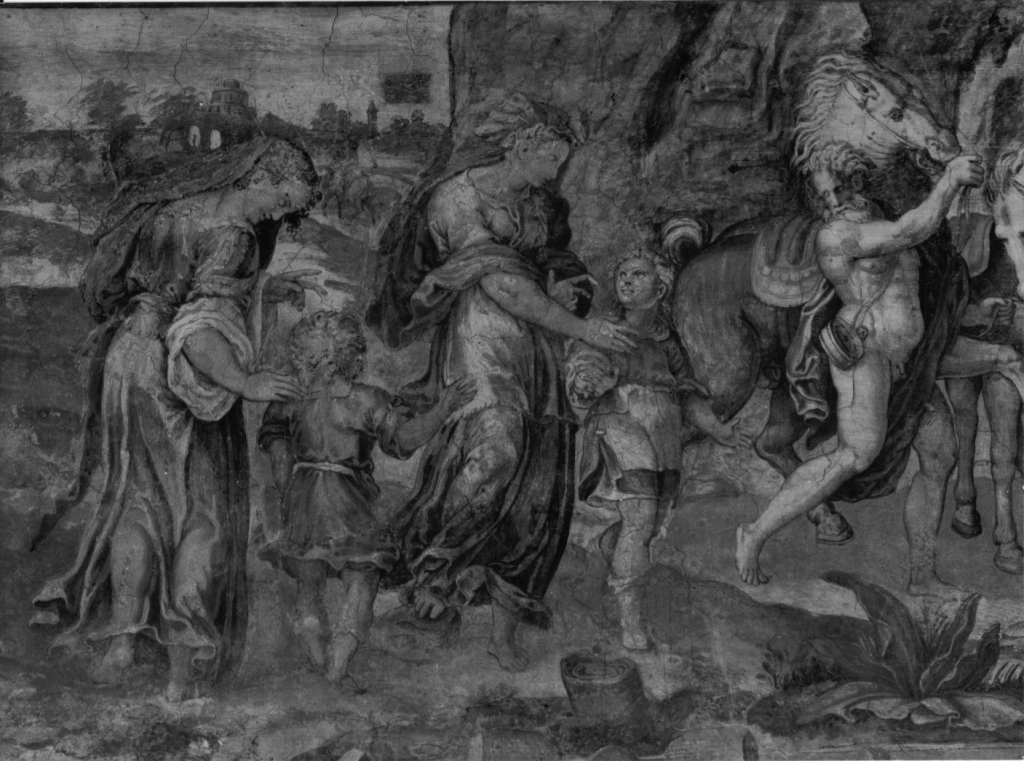 Figure maschili: uomo anziano; bambini. Figure femminili: donne. Animali: cavalli. Costruzioni: tempio