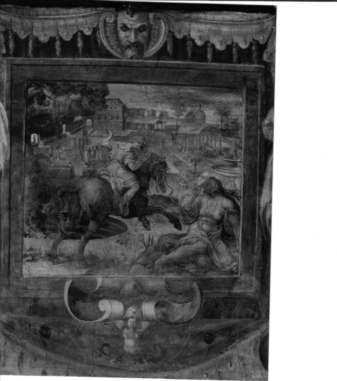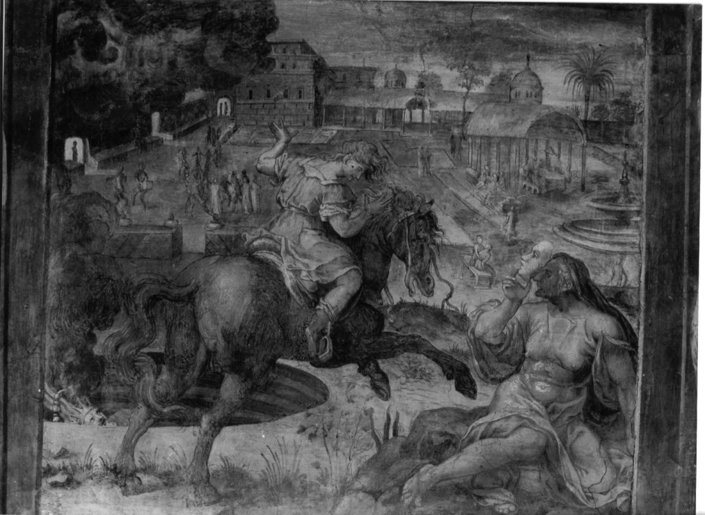 - NOTIZIE STORICO CRITICHE La scena ha un significato complesso: potrebbe trattarsi di una rappresentazione della vita attiva e dei pericoli in essa insiti (vecchia con maschera per l'inganno; il re sprofondato nella fossa per la vanagloria; il giovane sul cavallo per la perdita del controllo)