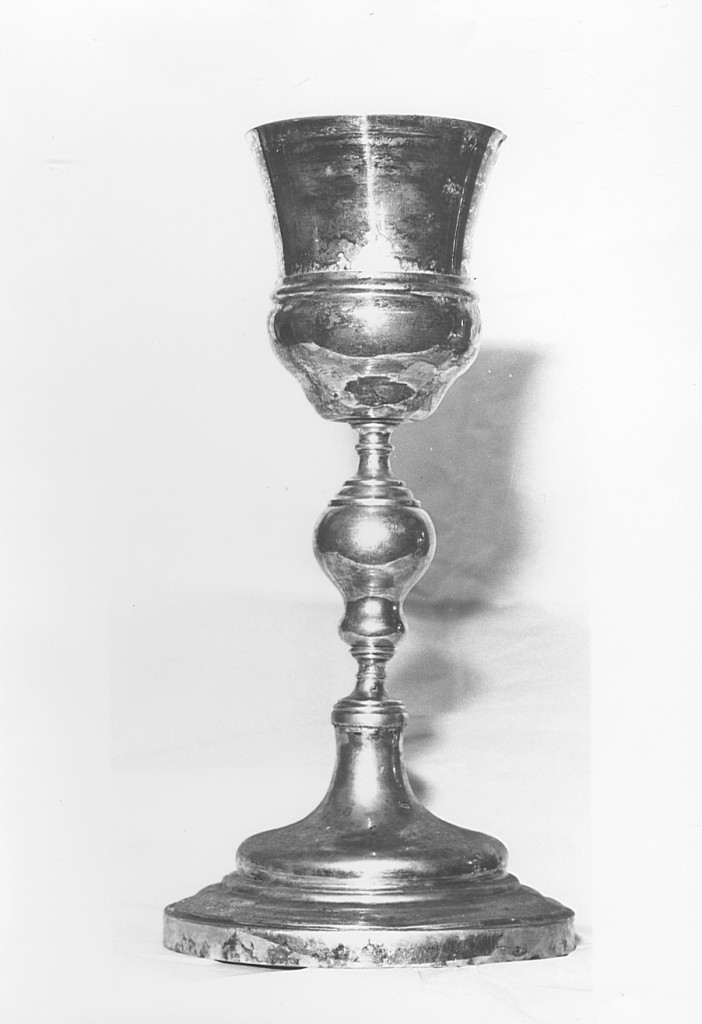 calice a sezione circolare, gradino liscio e una serie di modanature introducono alla campanula ugualmente liscia; fusto con nodo piriforme e sottocoppa liscio dal profilo rigonfio