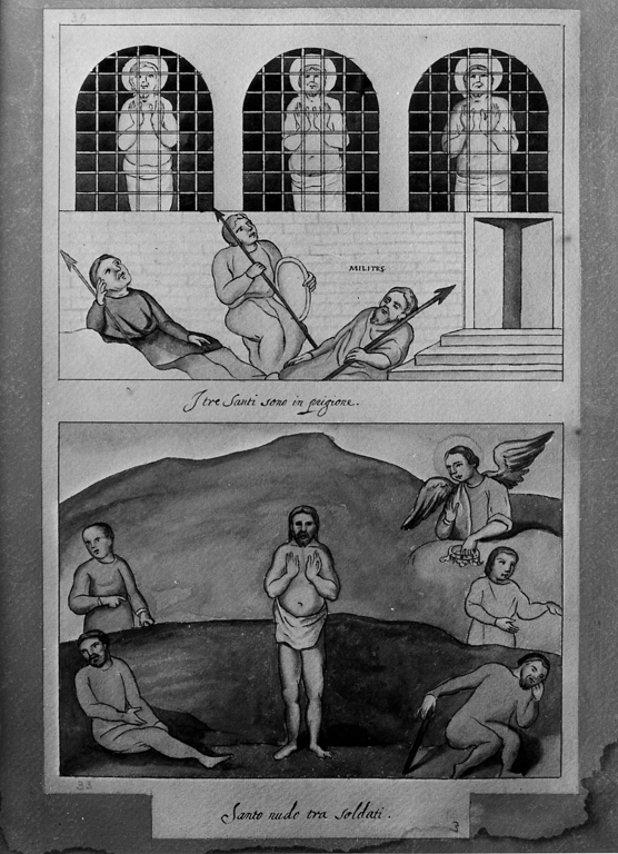 - ISCRIZIONI in basso - Santo nudo tra soldati - corsivo - a pennello - italiano volgare