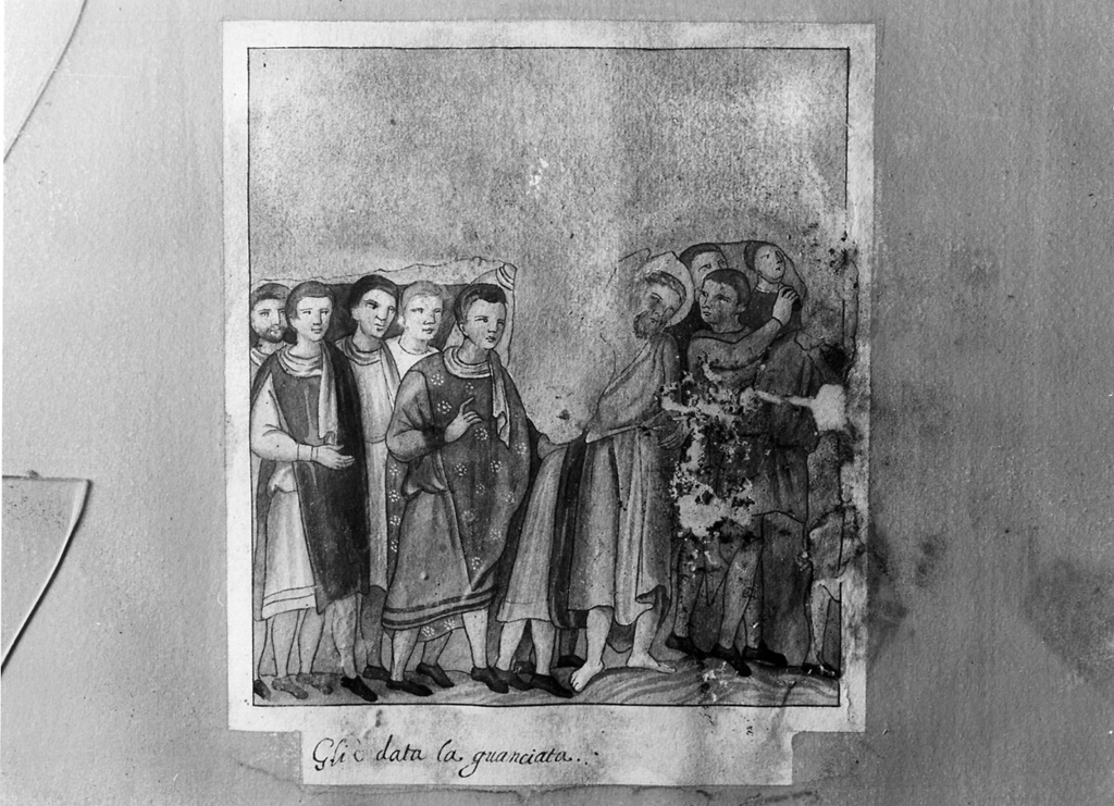 Parte superiore mancante. Al centro Cristo schiaffeggiato; intorno figure maschili