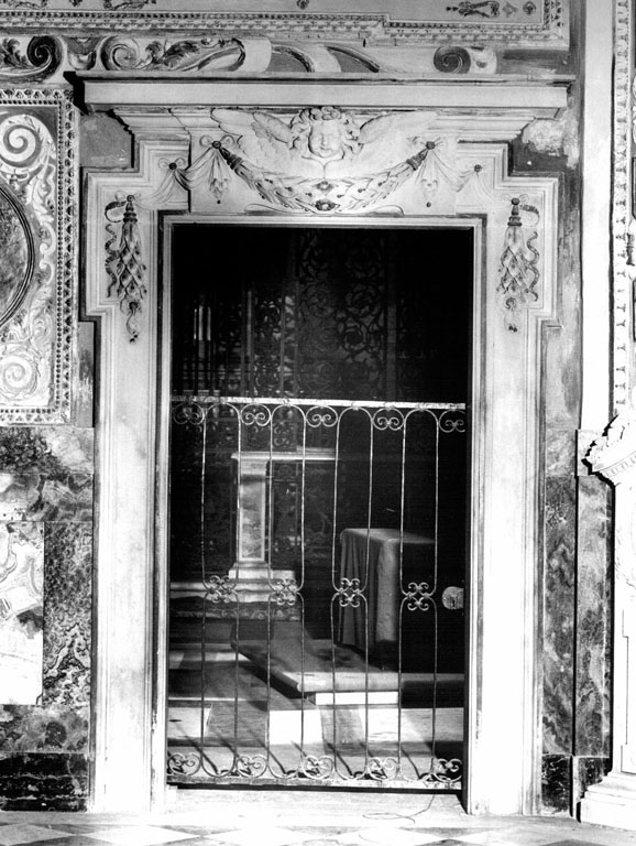 mostra ad incorniciatura marmorea con angoli spezzati; cherubino e festone di foglie appeso a nastri sull'architrave. Festoni laterali