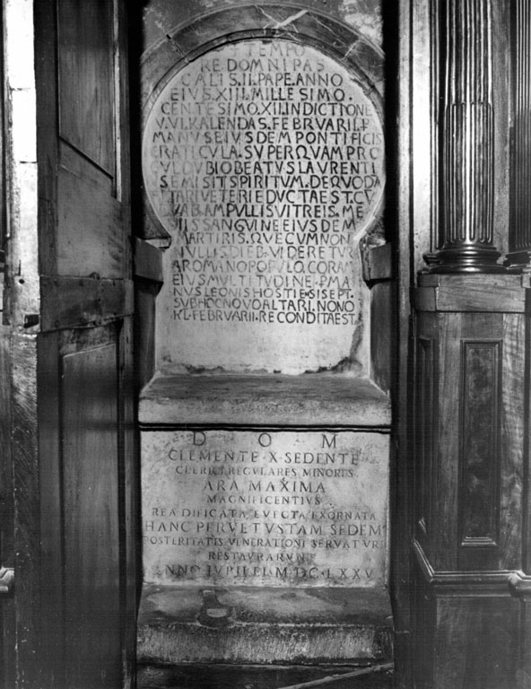 - ISCRIZIONI sullo schienale - TEMPO/ RE.DOM.NI.PAS/ CALI S II PAPE ANNO/ EIUS XIII MILLESIMO/ CENTESIMO XII INDICTIONE/ V VL KALENDAS FEBRUARII/ MANUS EIUS DEM PONTIFICIS/ CRATICULA SUPER QUAM PRO/ CUL DUBIO BEATUS LAURENTI/ NS EMISIT SPIRITUM DE QUOD A/ ALTARI VETERI EDUCTA EST CU/ DUAB AMPULLIS VITREIS ME/ DIIS SANGUINE EIUSDEM/ MARTIRIS QUE CUM NON NULLIS DIEB VIDERETUR/ A ROMANO POPULO CORAM/ EIUS MULTITUDINE P MA/ NUS LEONIS HOSTIENSIS EPI/ SUB HOC NOVO ALTARI NONO/ KL FEBRUARII RECONDITA EST. nella base: D.O.M./ CLEMENTE XSEDENTE/ CLERICI REGULARES MINORES/ ARA MAXIMA/ MAGNIFICENTIUS/ READIFICATA EVECTA EXORNATA/ HANC PERVETUSTAM SEDEM/ POSTERITATIS ULNERATIONI SERVATURI/ RESTAURARUNT/ ANNO IUBILEI MDC.LXXV - lettere capitali -