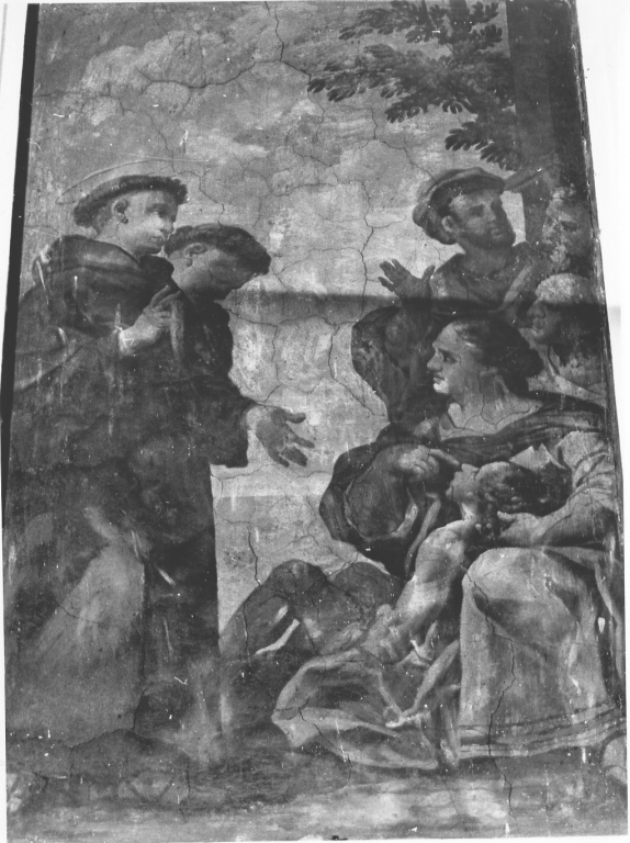 Sant'Antonio, accompagnato da un fraticello, fa risorgere un giovane che una donna, assisa a terra, sorregge; sullo sfondo tre personaggi assistono all'evento