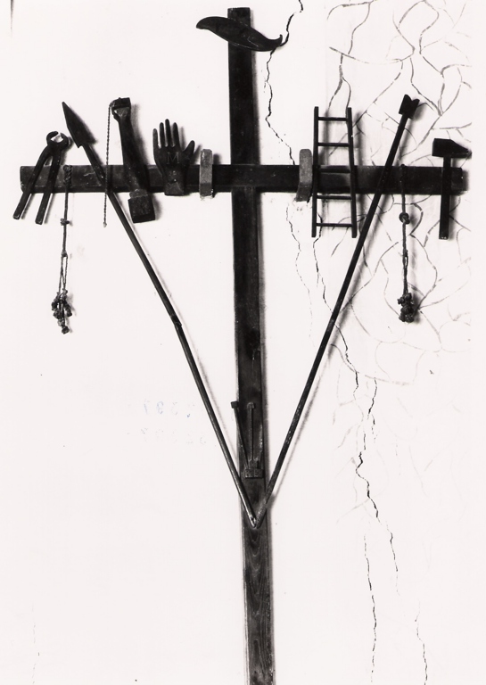 Croce dotata di simboli della Passione. Sul montante inferiore sono posti i dadi, i chiodi, la lancia e l'asta con la spugna; sulla traversa, la colonna, la tenaglia, il flagello e una mano a sinistra; a destra la scala, un altro flagello e il martello; sulla cimasa il titolo