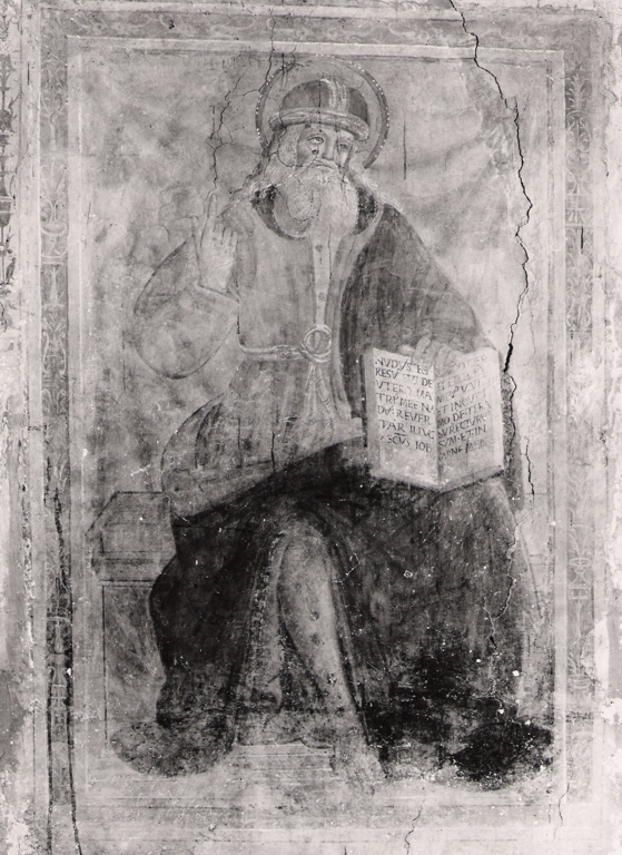 Una cornice con motivi a grottesche inquadra la figura. Il personaggio è seduto e regge nella mano sinistra un libro aperto con iscrizione; con la destra indica il cielo. Il capo è coperto da una corona orientale. Nella gamba destra scoperta si notano raffigurate le piaghe