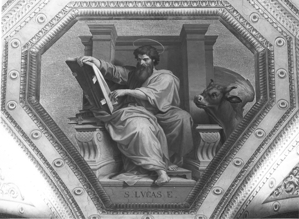 Soggetti sacri: San Luca Evangelista. Personaggi: San Luca Evangelista. Attributi: (San Luca) libro; bue alato. Oggetti: trono