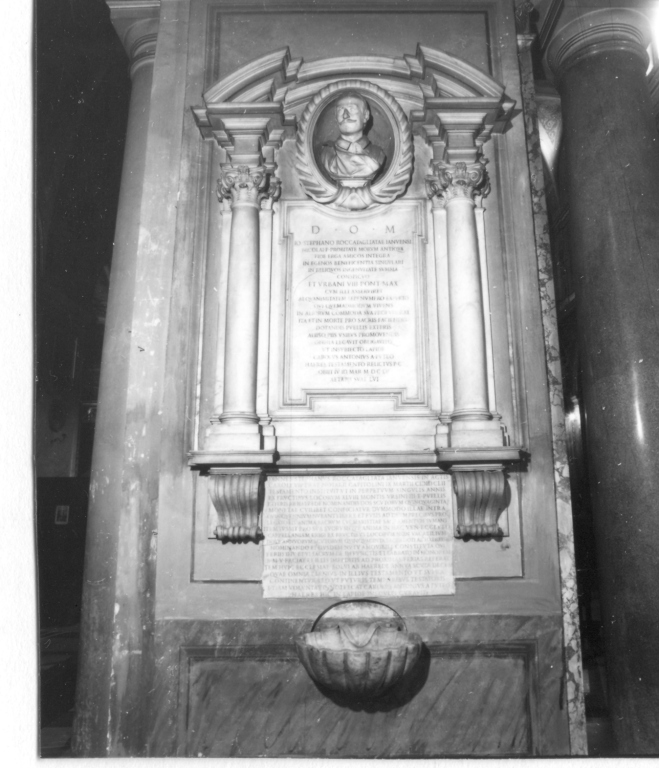 - NOTIZIE STORICO CRITICHE L'opera è segnalata dal Riccoboni (p. 260) senza tuttavia indicazioni, mentre D'Onofrio la attribuisce a un ignoto scultore del sec. XVII, a metà tra Bernini e Algardi. Giovanni Stefano Roccatagliata, patrizio genovese al servizio di Urbano VIII, mercante e collezionista di opere d'arte tra cui la Madonna Roccatagliata di N. Poussin, è qui ricordato come benefattore e legatore di una notevole somma di denaro all'orfanotrofio. Il monumento, posto dal suo esecutore testamentario mons. Carlo Antonio Dal Pozzo, doveva in origine trovarsi nella navata centrale, ma fu spostato nell'attuale posizione in seguito ai lavori di rifacimento della chiesa del 1866
