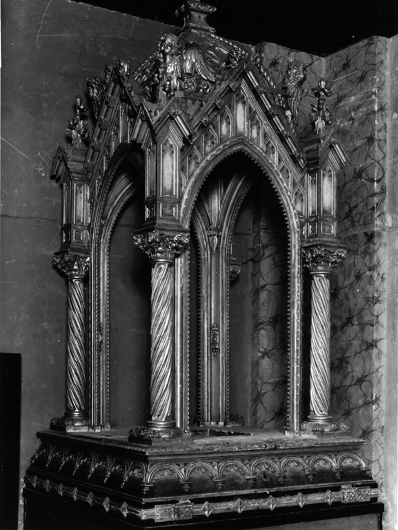 Macchina processionale in legno dorato in stile neo gotico; su una base quadrilatera si innalzano quattro colonnine con capitelli a foglie che sostengono pinnacoli e da cui partono le ornate nervature della copertura ogivale