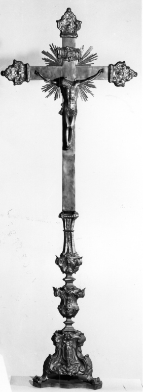 base a sezione triangolare poggiate su piedini a zampa voluta; fusto a balaustro con nodo a vaso decorato da volute, conchiglie e foglie; croce raggiata con bracci terminanti a piccole volute con conchiglia centrale