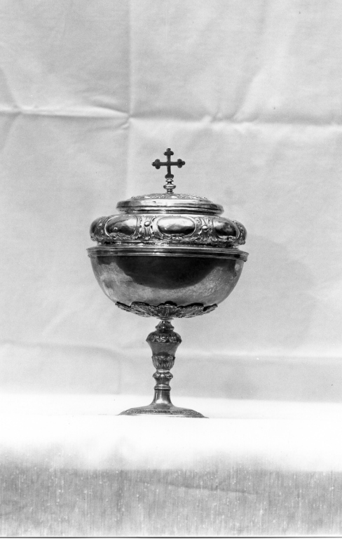 Base circolare decorata con motivi vegetali; fusto interrotto da un nodo; coppa liscia; coperchio bombato ornato da volute vegetali e ovoli; croce trilobata apicale