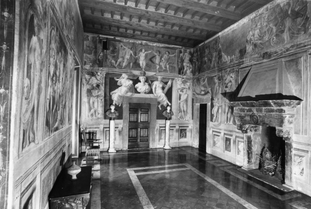 decorazione scandita in tre registri: in basso sono riquadri affrescati in finto marmo e scene monocrome intervallati da mansole dipinte. Il registro mediano presenta undici nicchie con figure allegoriche a grisaille: nella parete sinistra è un riquadro con scena di battaglia. Sovrapporte decorate con figure femminili allegoriche. Fascia superiore decorata da fregio con putti e figure femminile, interrotto agli angoli, da coppie di figure virili