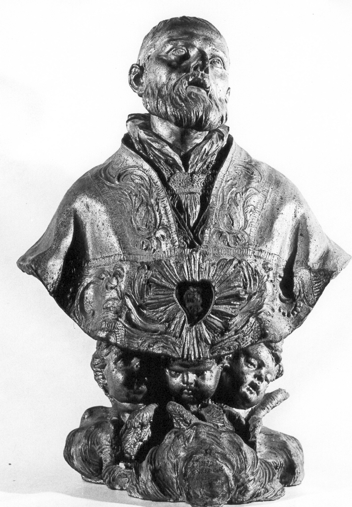 Base formata da cirri di nubi con testine cherubiche affioranti su cui poggia il busto del santo, in estasi, vestito dei paramenti sacri. Sul petto cuore raggiato recante iscrizione