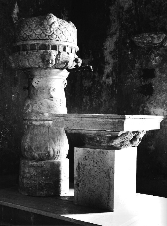 Fonte battesimale con base costituita da un tronco di colonna sottilmente scanalato. Segue poi il fusto a forma di bulbo con larghe foglie che si allargano esternamente; quindi due delfini in bassorilievo che si avvitano lungo l'intera circonferenza; il coperchio è emisferico decorato da teste di cherubini e da motivo a scaglie. La vasca porta scolpite quattro teste di cherubini ad ali aperte
