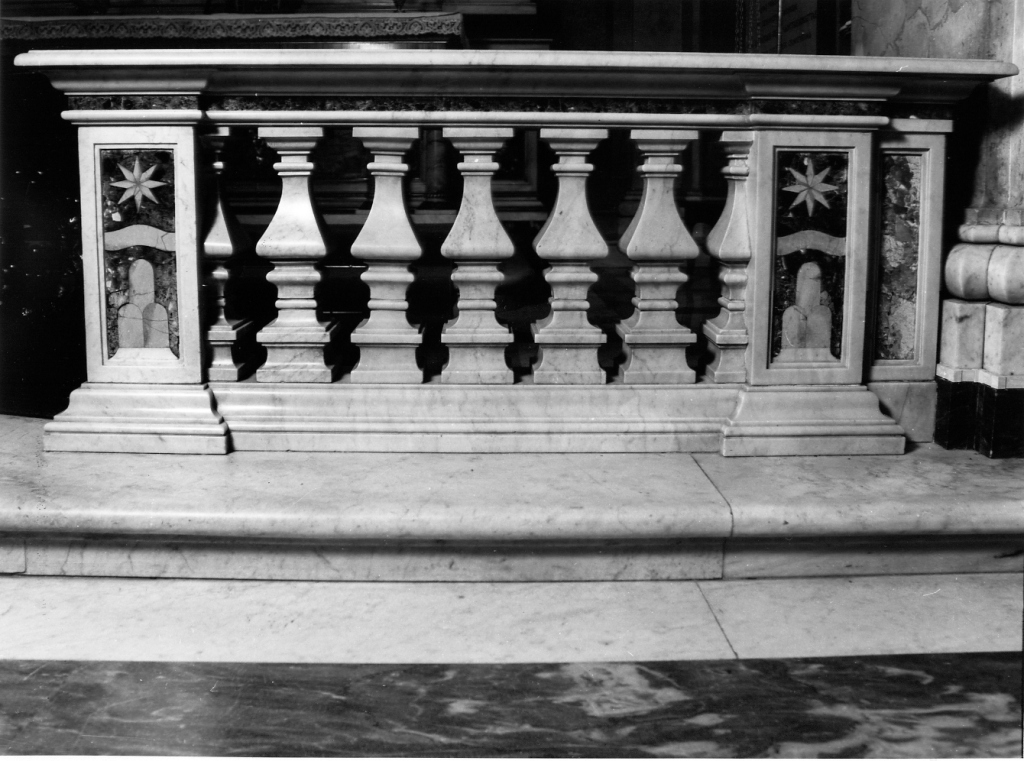 Balaustrata in marmo bianco caratterizzata da cornici ribassate dello stesso materiale e da pilastrini decorati a tarsie marmoree in marmo giallo e verde antico raffiguranti emblema
