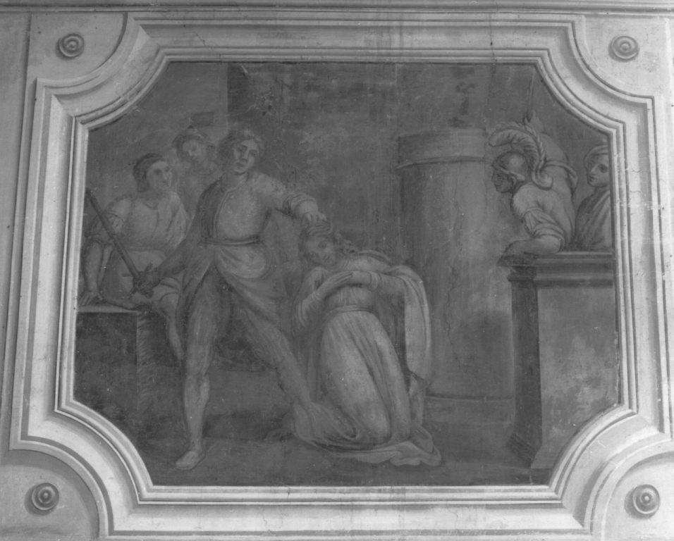 cornice a finto marmo dipita a tempera. Scena dipinta a monocromo